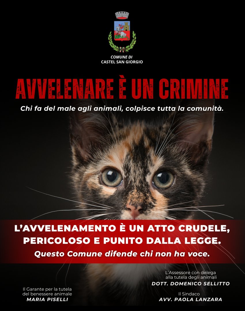 Il sindaco di Castel San Giorgio, Paola Lanzara, l'assessore alla Tutela Animale, Domenico Sellitto, e la Garante per i diritti degli animali, Maria Piselli, hanno avviato una campagna di sensibilizzazione contro l’avvelenamento di cani e gatti e contro ogni tipo di reato e maltrattamento nei confronti degli animali. L’iniziativa nasce in risposta a diversi episodi gravi registrati negli ultimi mesi in varie frazioni del territorio comunale, che hanno coinvolto animali domestici e randagi.