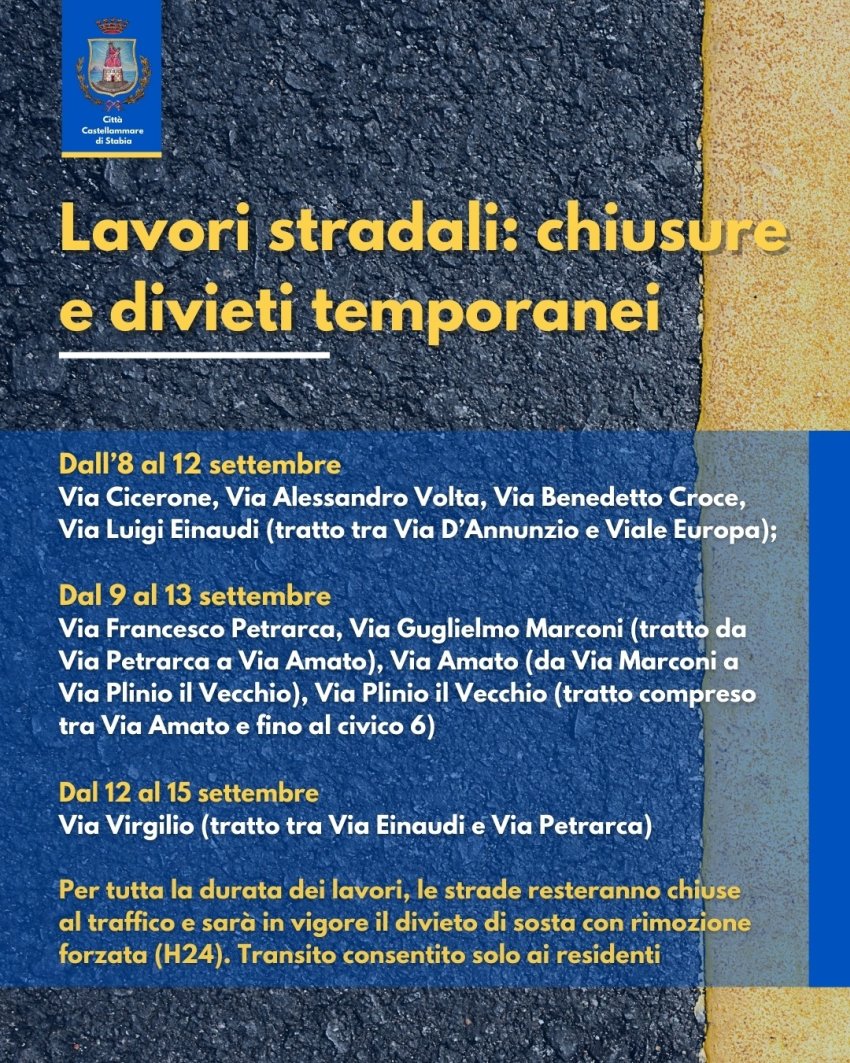 Proseguono i lavori di ripristino del manto stradale a Castellammare di Stabia. Lo comunica sui social il sindaco, Luigi Vicinanza. Da lunedì 8 a lunedì 15 settembre 2025, sono in programma modifiche alla viabilità cittadina, che prevedono la chiusura al transito veicolare e il divieto di sosta con rimozione forzata (h24) in diverse aree della città.
