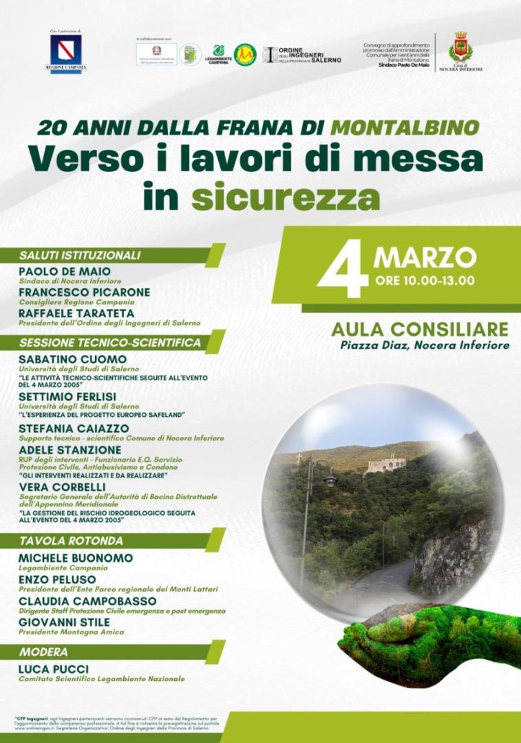 Si svolgerà martedì 4 marzo, in Aula Consiliare, il convegno “Vent’anni dalla frana di Montalbino. Verso i lavori di messa in sicurezza”, per ricordare le vittime che persero la vita nel 2005 e approfondire gli interventi di messa in sicurezza riguardanti la zona pedemontana di Nocera Inferiore.