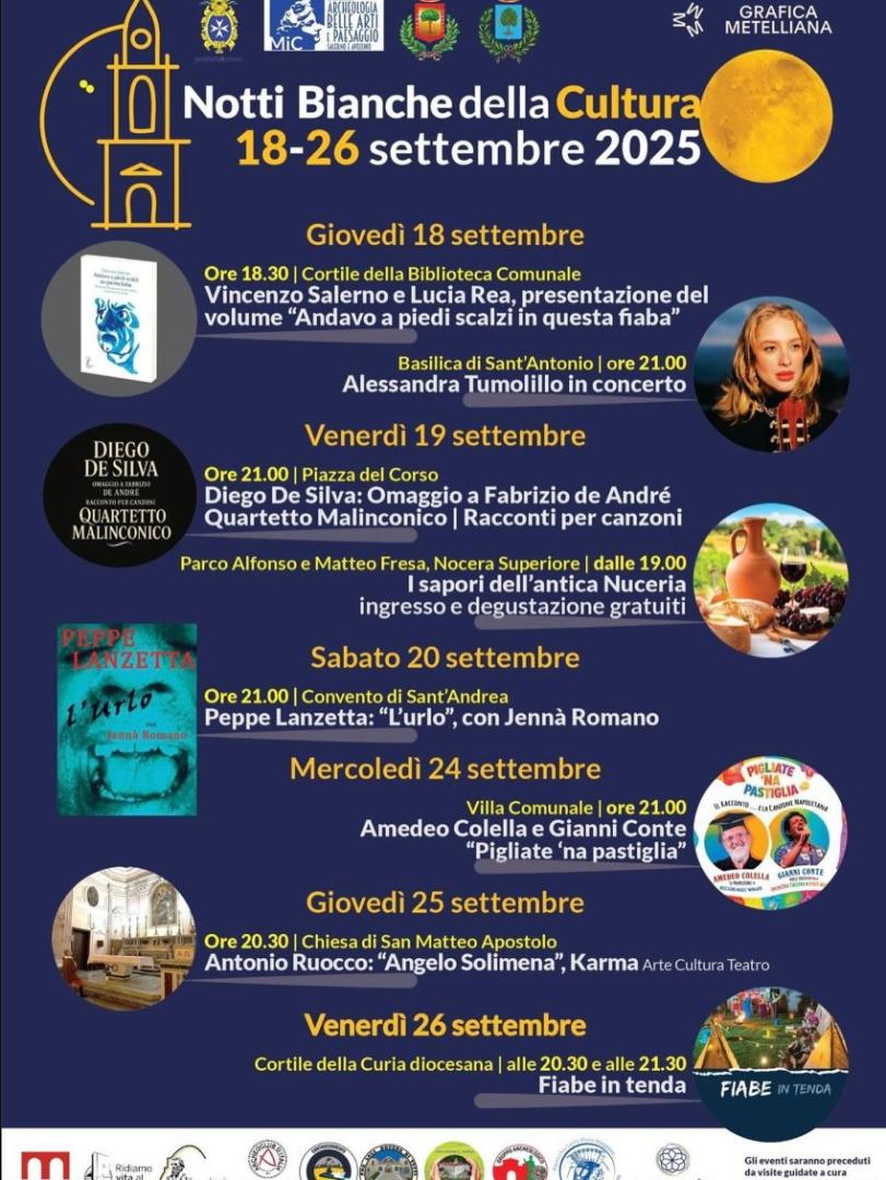 Dal 18 al 26 settembre 2025, Nocera Inferiore si trasforma in un palcoscenico diffuso con le "Notti Bianche della Cultura". Grandi autori, concerti e spettacoli incontrano i luoghi più suggestivi del patrimonio storico e artistico cittadino. Inaugura la kermesse, nel cortile della Biblioteca Comunale, la presentazione del libro "Andavo a piedi scalzi in questa fiaba".