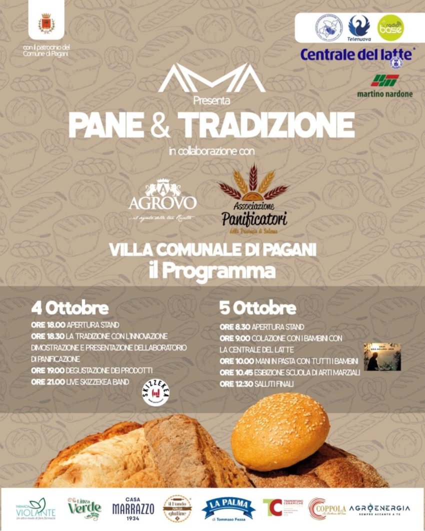 Il 4 e 5 ottobre, la Villa Comunale di Pagani si trasforma in un paradiso per gli amanti del pane, della tradizione e del buon cibo. Un evento in sinergia con AMA e Associazione Panificatori Provincia di Salerno. Non solo pane appena sfornato, ma anche prodotti tipici del territorio offerti dai food sponsor Agrovo Alimentari, Casa Marrazzo, Linea verde, Dall'orto alla tavola, La Palma alimentari. In agenda show-cooking e laboratori.