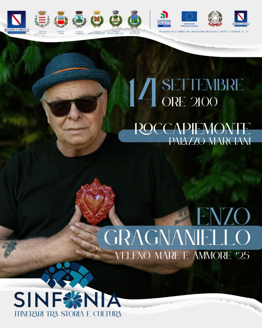 Nell'ambito del progetto "Sinfonia. Itinerari tra storia e cultura", Roccapiemonte ospita il concerto di Enzo Gragnaniello, protagonista del tour 2025 "Veleno, mare e ammore" (titolo di un suo storico album). Lo spettacolo, in programma domenica 14 settembre, ore 21:00, si terrà negli spazi di Palazzo Marciani.