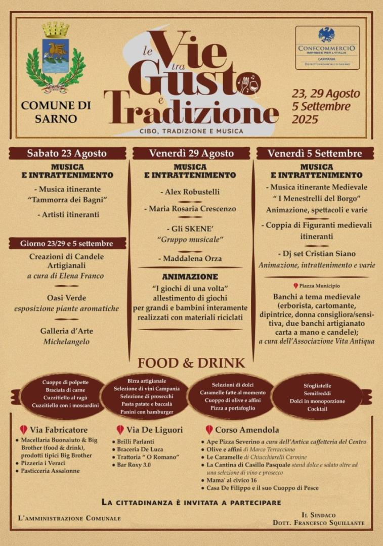 Torna anche quest’anno, a Sarno, l’atteso evento culturale ed enogastronomico “Le Vie tra Gusto e Tradizione”, organizzato dal Comune in collaborazione con Confcommercio Campania - Distretto provinciale di Salerno. L’iniziativa è pensata per valorizzare la città e il suo centro storico, attraverso un percorso che unisce musica, storia, enogastronomia, prodotti tipici del territorio e tradizioni locali.